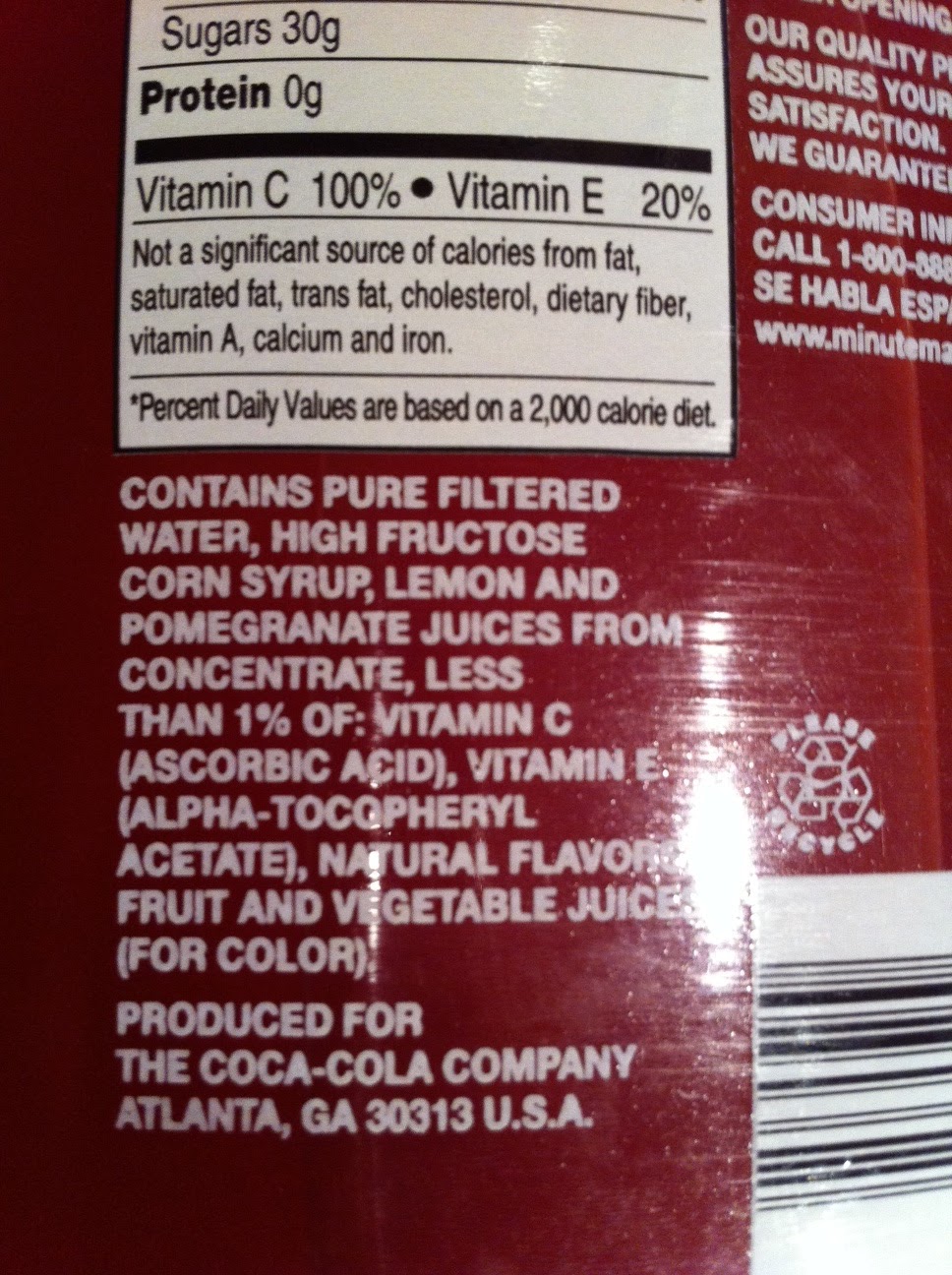 The Minute Maid juice is sold as a “Pomegranate Blueberry Flavored Blend of 5 Juices.” It is mostly apple and grape juice with just 0.3 percent pomegranate juice and 0.2 percent blueberry juice, according to a POM court filing.