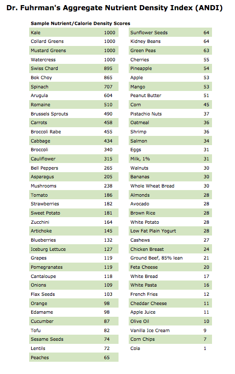 Popularized by Dr. Fuhrman, a renowned doctor, author, and researcher, the aggregate nutrient density index is a method to help us find foods with the highest density of nutrition. The calculation for nutrient density looks like this: