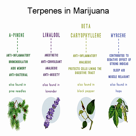 Remember how I told you I thought all weed smelled the same? Katie felt the same way when she was younger, but now she can tell a strain just by its scent. That’s because each one has a special blend of terpenes, which are “organic compounds produced by a wide variety of plants that are used in perfumery, aromatherapy and even food flavouring,” says Katie. “When you smell lavender essential oil, for example, those are terpenes that you’re inhaling and you’re receiving those molecules into your olfactory nerves and sending messages to your brain.” Those terpenes have the ability to promote wellness, the same way that breathing in lavender essential oil promotes a calm feeling. Here’s some more information on how terpenes can boost your health.